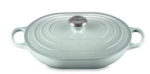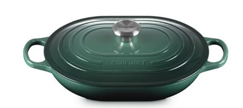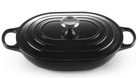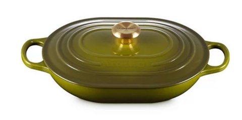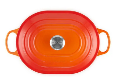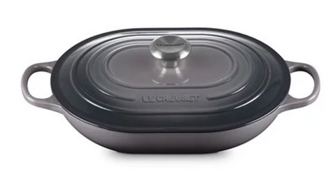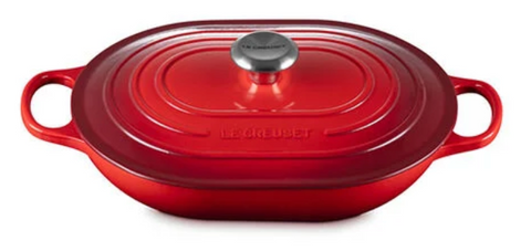 Perfect for sautéing, shallow frying, steaming and serving dishes straight to the table, the enameled cast iron Signature Oval Casserole can handle everything from roasts and whole fish to vegetables and side dishes. The elongated oval shape is ideal for larger cuts of meat, hearty stews and baked casseroles meant to share. The sloped sides and wide cooking surface make stirring and serving a breeze. Use it with the lid as a traditional casserole for family meals, or without as a roaster or buffet dish when entertaining guests.